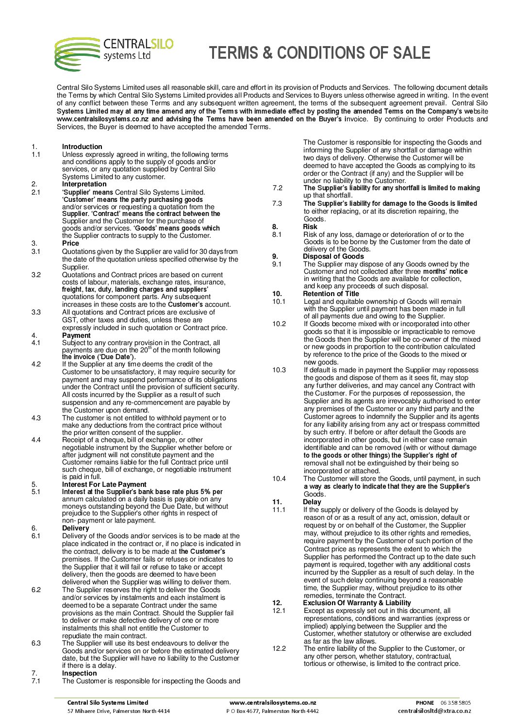 Central Silo Systems Limited uses all reasonable skill, care and effort in its provision of Products and Services. The following document details the Terms by which Central Silo Systems Limited provides all Products and Services to Buyers unless otherwise agreed in writing. In the event of any conflict between these Terms and any subsequent written agreement, the terms of the subsequent agreement prevail. Central Silo Systems Limited may at any time amend any of the Terms with immediate effect by posting the amended Terms on the Company’s website www.centralsilosystems.co.nz and advising the Terms have been amended on the Buyer’s invoice. By continuing to order Products and Services, the Buyer is deemed to have accepted the amended Terms.